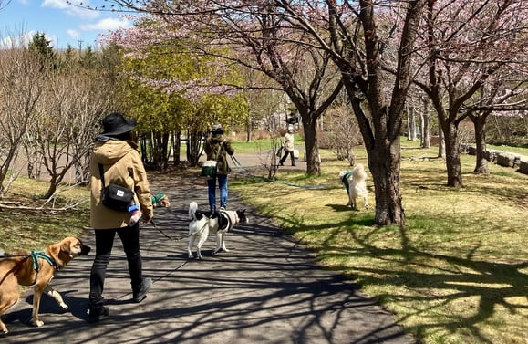 NATURAL DOGのソーシャルウォークは、3-5組の小さなグループ+私で、公園や河川敷を穏やかに歩きます。